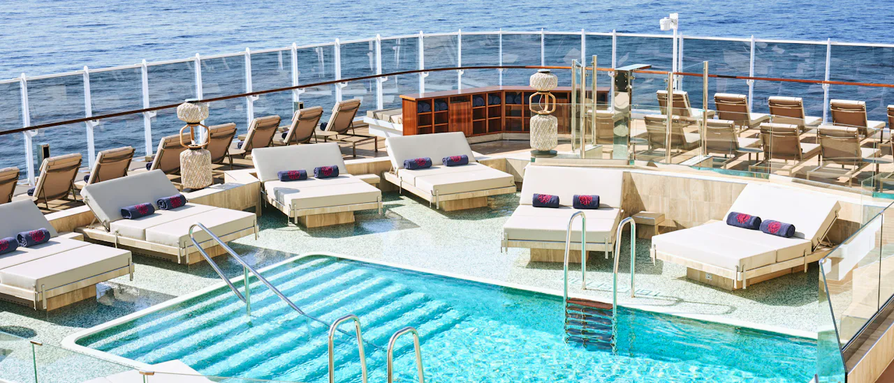 Generösa utomhusdäck stoltserar med mer än 2 500 kvm, en fantastisk utsikt över havet och 64 privata solsängar över 3 utomhuspooler.